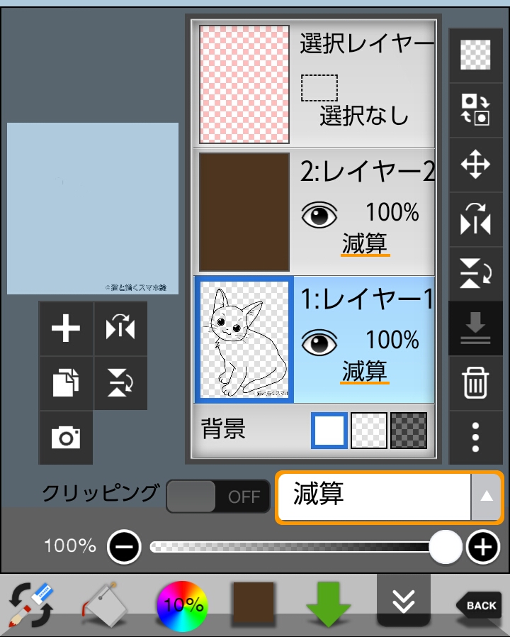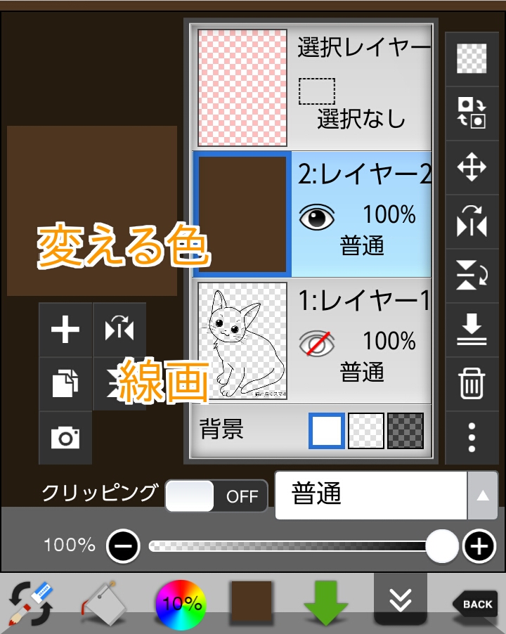 ①レイヤー1に線画を描き、レイヤー2に変えたい色(ここでは茶色)を塗ります。②レイヤー1、2のブレンドモードを「減算」にします。