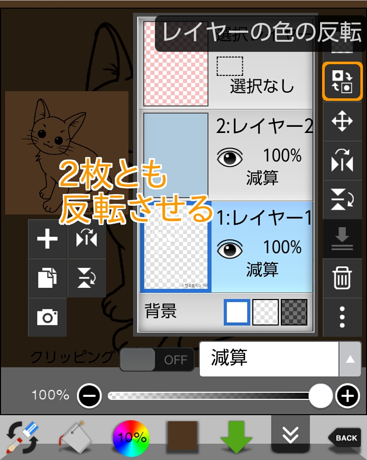 ③レイヤー1、2を「レイヤーの色の反転」で反転させます。