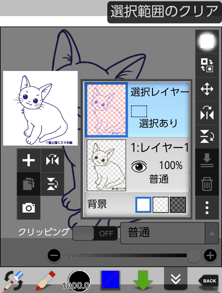 ③選択レイヤー(一番上のレイヤー)をカレントレイヤーにして「選択範囲のクリア」をタップすると、点線が消え、色変え完了です。