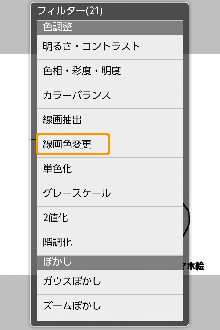 ①「ツール選択ウインドウ」の「フィルター」をタップします。②フィルター一覧から「線画色変更」を選択します。